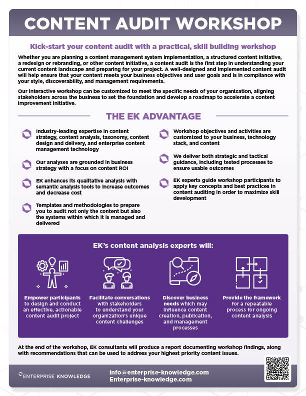 • EK experts guide workshop participants to apply key concepts and best practices in content auditing in order to maximize skill development