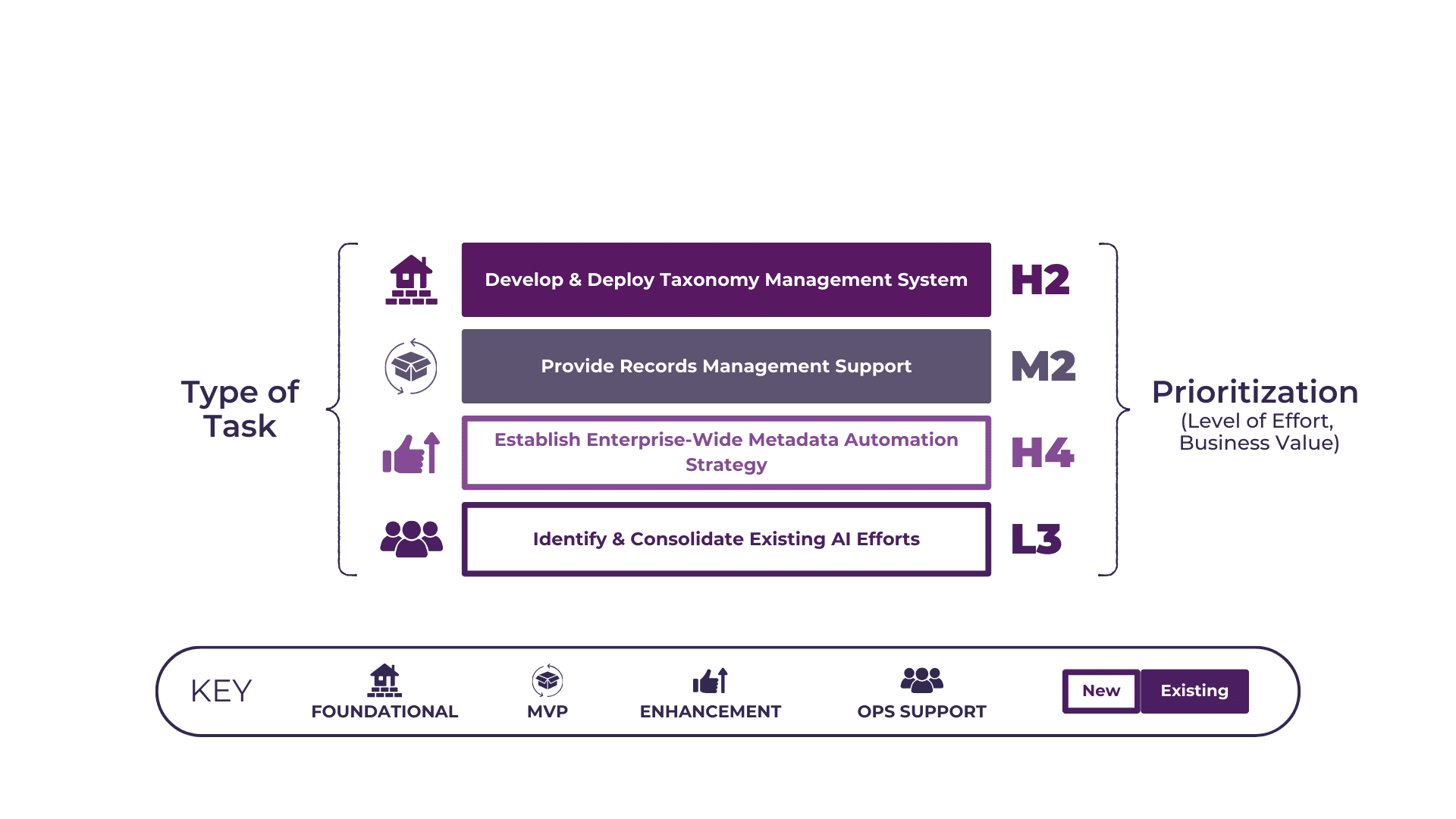 To strengthen and connect the organization’s AI strategy, EK threaded automation throughout and incorporated it within each workstream wherever possible and/or feasible. The goal of this was to improve business efficiency and productivity, as well as to move the team one step closer to making IM “invisible.” Each task was also assigned a type (foundational, MVP, enhancement, operational support), level of effort (low, medium, high), business value (1 (low) to 5 (high) on a Likert scale), and ownership (portfolio vs. individual products). EK marked which tasks already existed in the product roadmaps and which ones were newly recommended to supplement them. By mapping the tasks to the 5 workstreams in both a visual roadmap diagram and an accompanying spreadsheet, the IM team was able to see where tasks were dependent on each other and where overlap was occurring across the portfolio.