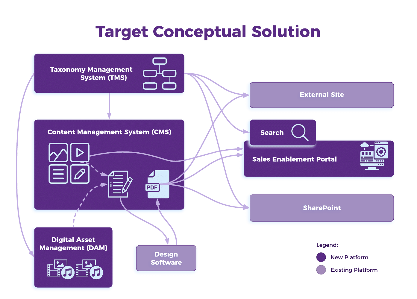 In addition to delivering the content strategy and product content model, EK provided the architecture and development of an enterprise content ecosystem. Expert solution architects collaboratively documented a comprehensive list of requirements and analyzed the organization’s current content tech stack. EK leveraged content strategy insights from related workstreams to identify cross-departmental touchpoints that would benefit from specific systems and illustrate where necessary taxonomy and content management system integrations would enhance content operation processes. The target solution enabled digital asset management, complex workflows, content reuse, dynamic content assembly, and multi-channel publishing.