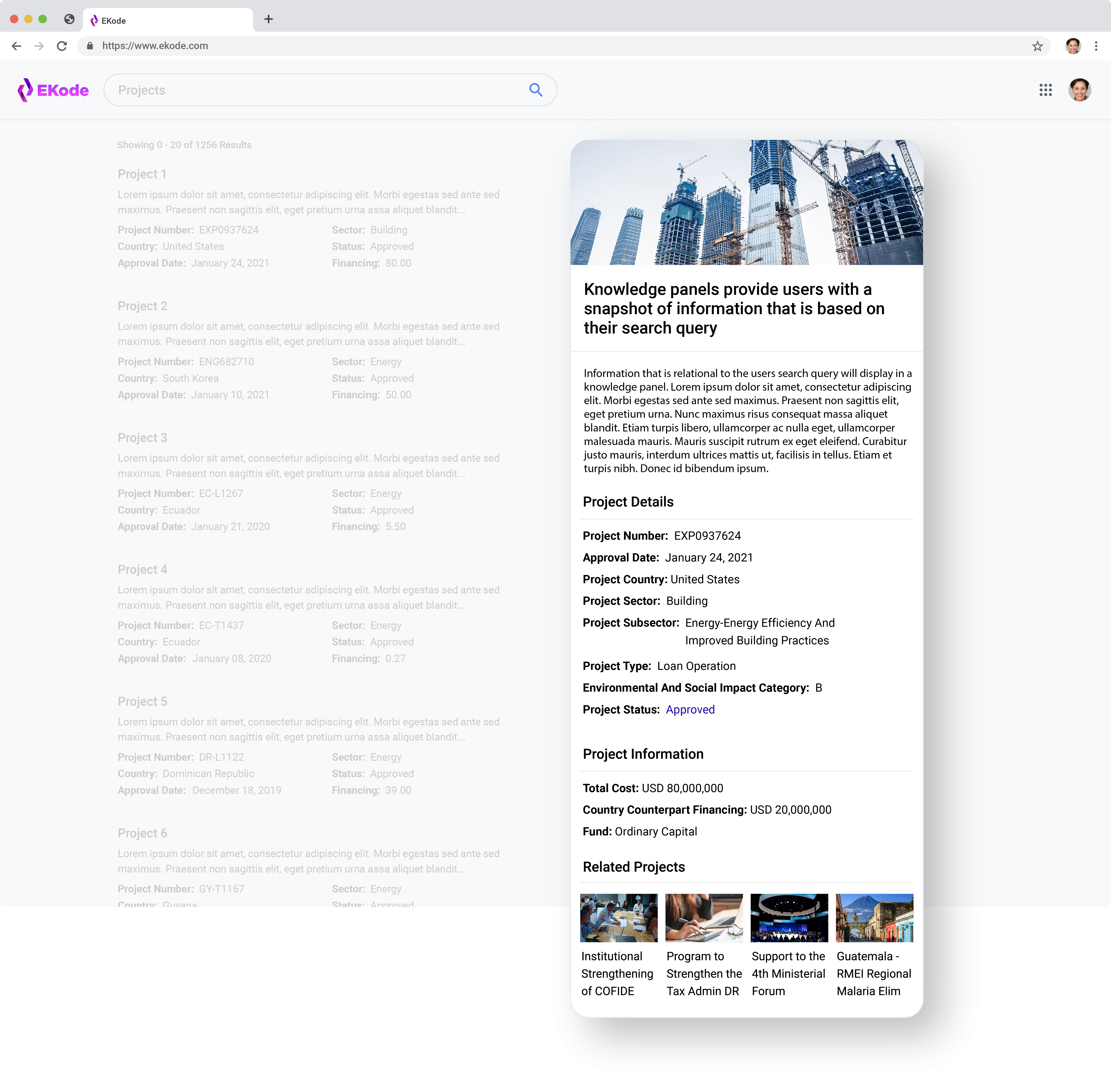 Along the same line as the above, surface additional information, properties and relationships, about the search query and search results from the knowledge graph. If a specific term or entity is recognized in the search query, use that to populate a knowledge panel on the right hand side with all relevant information about that term or entity. A knowledge panel provides users with a snapshot of information based on their search query. When displaying the knowledge panel and search results, pull the most up-to-date contextual information about a search result from the knowledge graph. For example, contextual information could include project statuses, most recent documents, or most similar content within the knowledge graph by metadata.